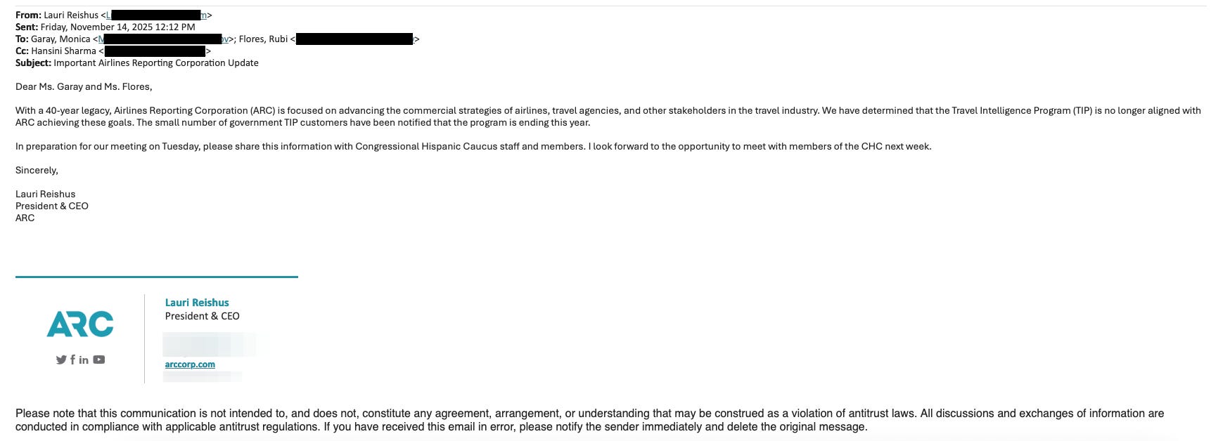 In her email to Congressional Hispanic Caucus staff, CHC members requested a meeting with Reihaus this week to discuss the program’s termination. The lawmakers’ letter had urged ARC to “adopt a policy of only turning over Americans’ travel records to the government when legally compelled to do so, except in emergencies.”