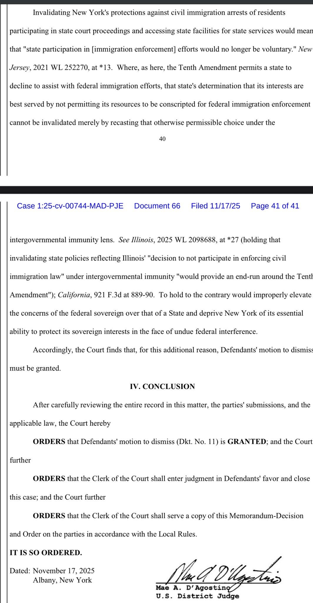 In a sharply worded conclusion, Judge D’Agostino granted New York’s motion to dismiss and ordered the Clerk of the Court to enter judgment in New York’s favor and close the case. The decision marks a significant win for state autonomy in immigration policy, confirming that local governments cannot be compelled to allocate resources or change practices solely because of federal enforcement preferences.