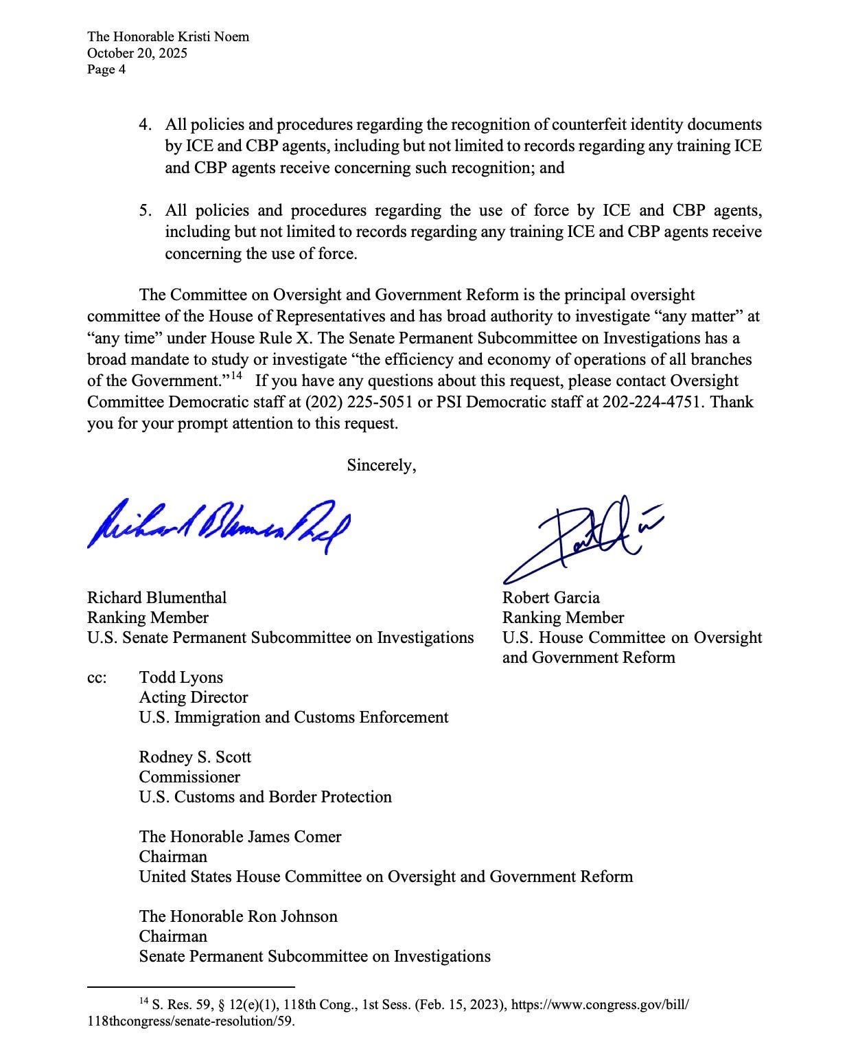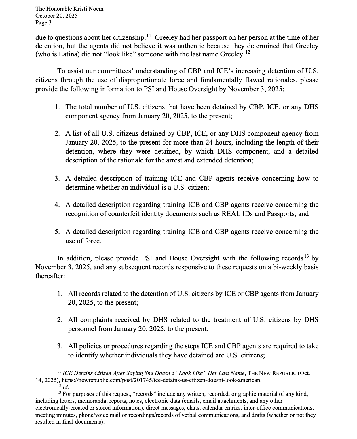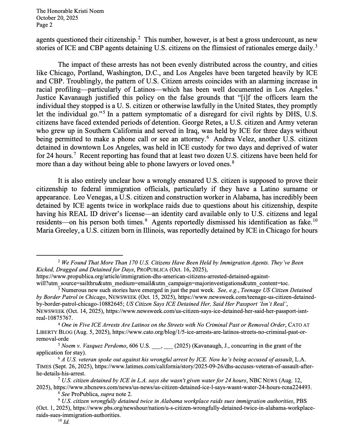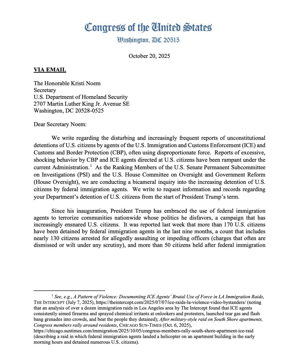 In a letter sent to Noem, top Democrats from the Senate Permanent Subcommittee on Investigations and the House Committee on Oversight and Government Reform condemned what they called unconstitutional detentions and “disproportionate force” against citizens. The lawmakers cited reports that more than 170 U.S. citizens have been detained by immigration agents in the past nine months, with dozens held for more than 24 hours and many unable to contact attorneys or loved ones.