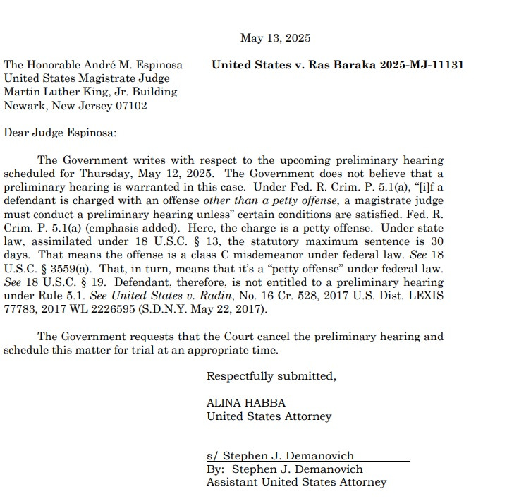 In a surprising decision, US Attorney for New Jersey notified the court that the Justice Department does not believe a preliminary hearing is necessary Thursday in the case of the Mayor of Newark, Ras Baraka, citing what they referred to as a “petty offense.”