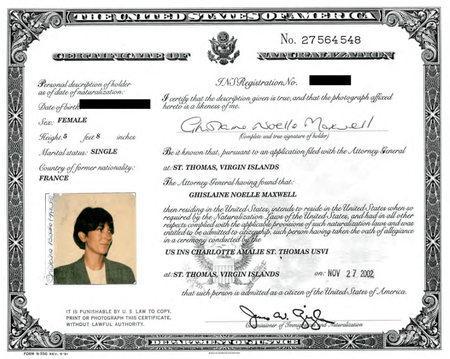 Maxwell’s application was approved, and she was naturalized as a U.S. citizen on November 27, 2002, in St. Thomas, U.S. Virgin Islands.