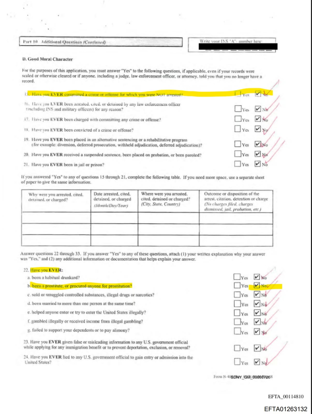 The naturalization documents, filed in the U.S. District Court for the Southern District of New York, show Maxwell checked “No” to two critical questions on her N-400 Application for Naturalization: