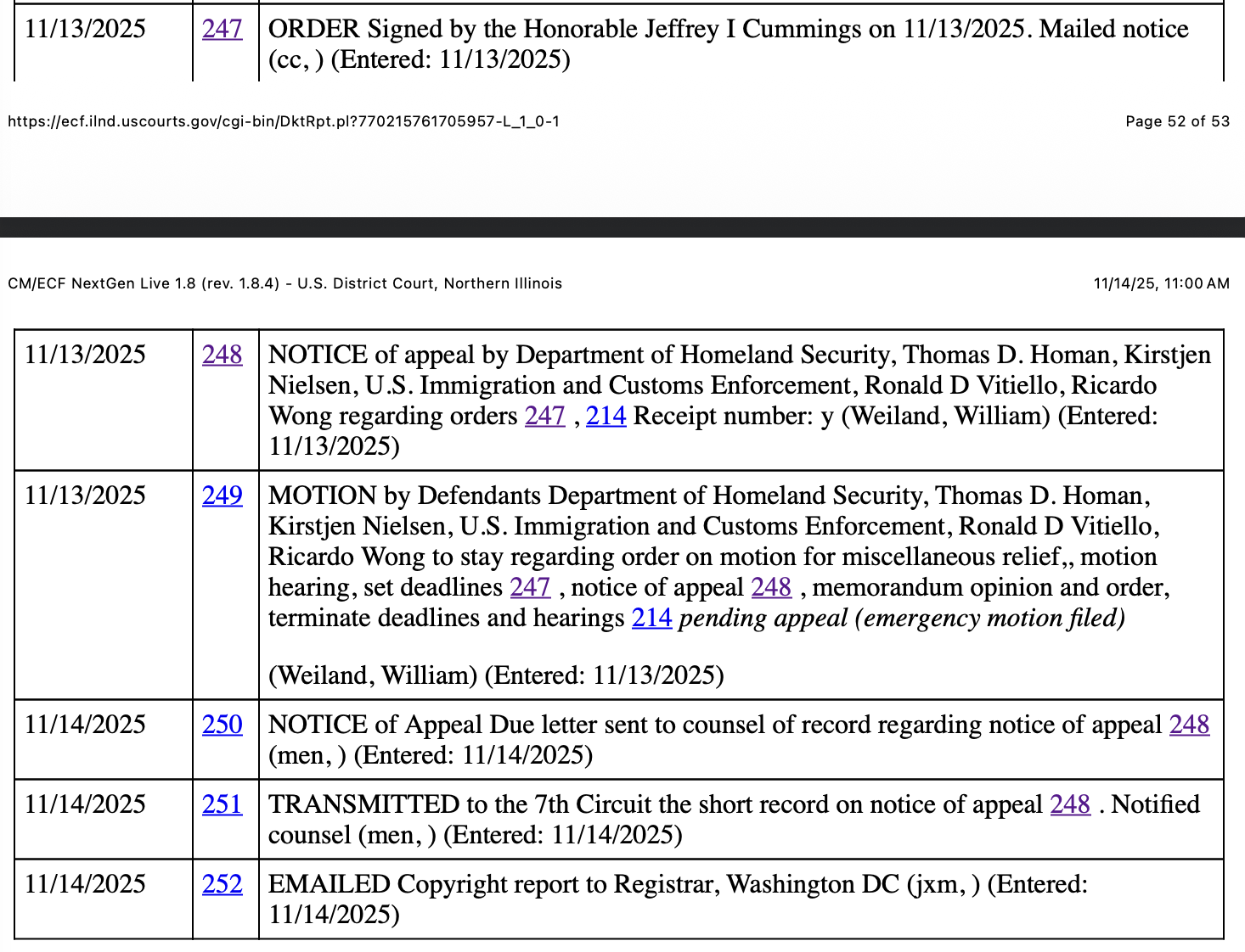 WASHINGTON — In a surprising development in the ongoing enforcement litigation involving Operation Midway Blitz, the court issued the stay on the last page of the docket in the Castanon Nava et al v. Department of Homeland Security case.