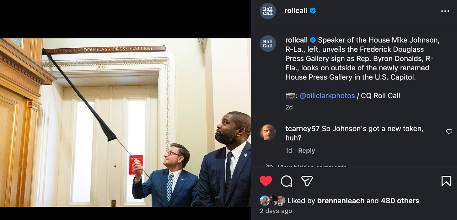 Speaker Mike Johnson pulled the sheet off the sign with Rep. Byron Donalds, the Florida Republican who spent a year pushing this through, and everybody clapped. The Acting Librarian of Congress brought up some Douglass artifacts. Conservatives and Black lawmakers stood together for the photo op. They called it bipartisan and historic, which in Congress means they all agreed on something that costs nothing.