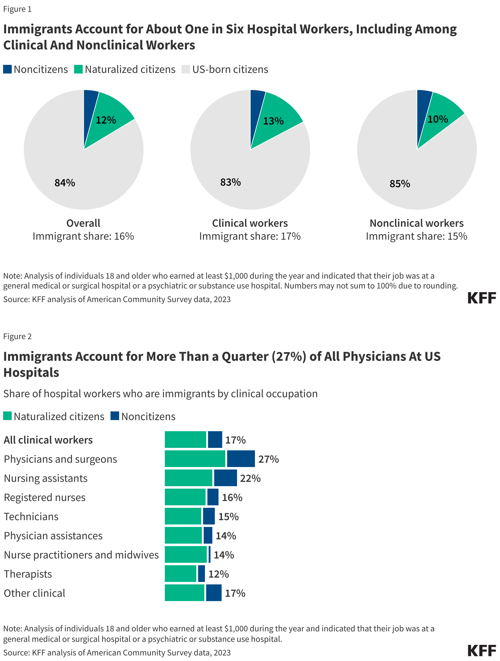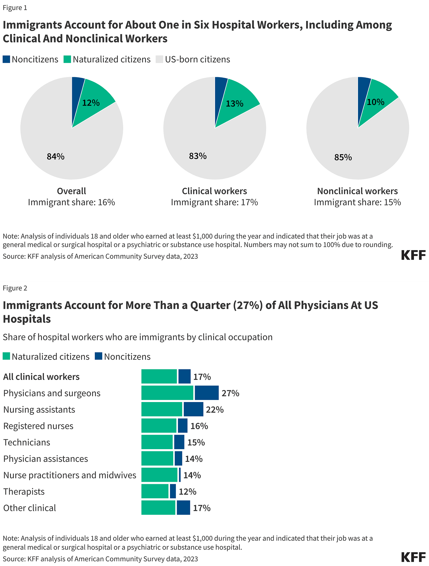A KFF analysis shows that at U.S. hospitals, immigrants account for about 1 in 6 clinical and nonclinical workers and more than a quarter of doctors.