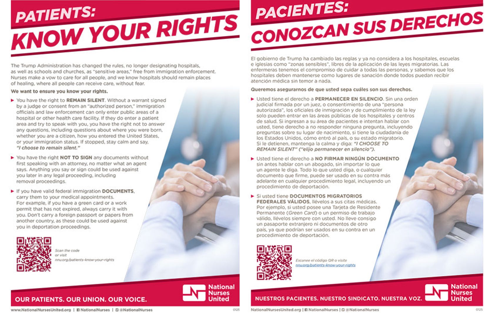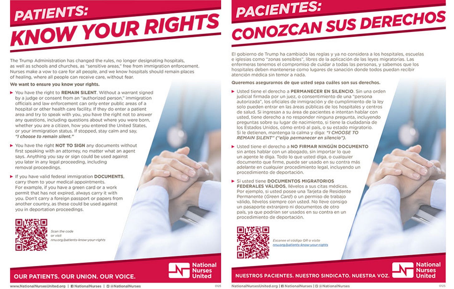 In New York, her union has distributed know-your-rights pamphlets in community centers, churches and food banks. The pamphlets encourage patients to carry valid immigration documents to appointments and remind them of their right to remain silent.